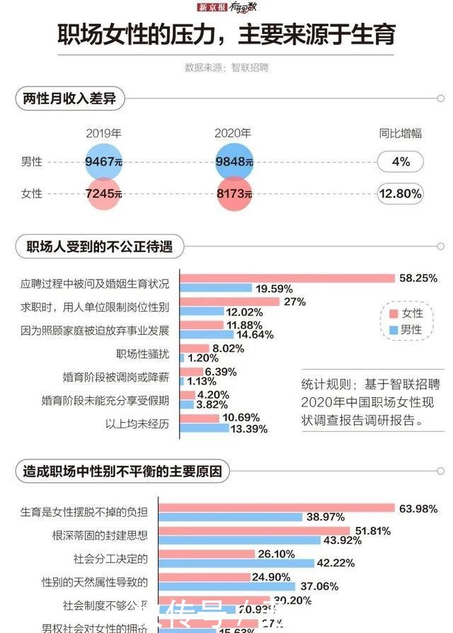 据某招聘网站调研数据显示,女性在职场上遭遇到不公正待遇。有58.25%的女性在应聘过程中被问及生育状况,63.98%女性认为生育是女性职场摆脱不掉的负担。