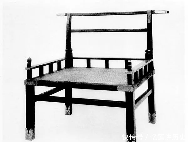 现藏首都博物馆,北京市陶然亭唐何府君墓出土壁画,唐史思明天顺元年759年。墓主坐一搭脑弯曲的方材椅子,但似乎没有靠背。画面下部虽已脱落,但肘部位置应无扶手。